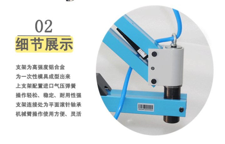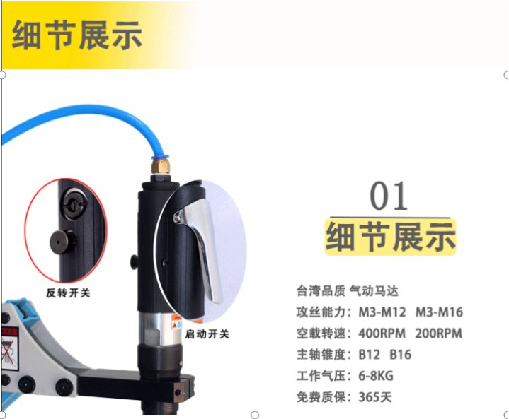 气动攻丝机产品特点1.新型专利产品,压缩空气驱动,安全快速高效。细节展示 01台湾品质 气动马达攻丝能力:M3-M12M3-M16空载转速:400RPM200RPM主轴锥度:B12B16工作气压:6-8KG细节展示 02支架为高强度铝合金为一次性模具成型出来上支架配置进口气压弹簧操作轻松、稳定、耐用性强支架连接处为平面滚针轴承机械臂操作使用方便